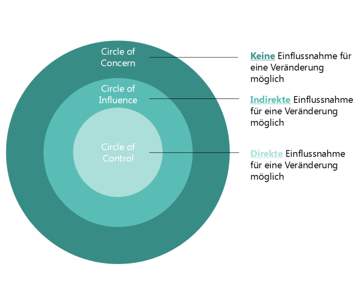 One model that offers guidance here is Stephen Covey's Circle of Influence. It distinguishes between what people have direct influence over, what they have limited influence over, and what is beyond their control. Especially in complex organisations, this awareness helps to focus energy on what can be shaped and to let go of what is beyond one's sphere of influence. This clarity often has an immediate relieving effect.